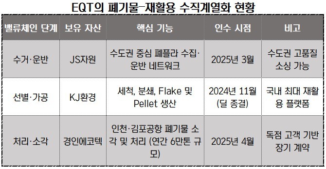 글로벌 사모펀드(PEF) EQT파트너스가 국내 폐기물 시장 내 전략적 플레이어로 진화하고 있다. 지난해 ‘1조원 클럽’에 오른 KJ환경 인수를 시작으로 수도권 기반 수거·운반 업체에 이어 소각 처리 기능까지 확보하며 수직계열화된 순환경제 플랫폼을 실질적으로 완성한 것으로 평가된다.